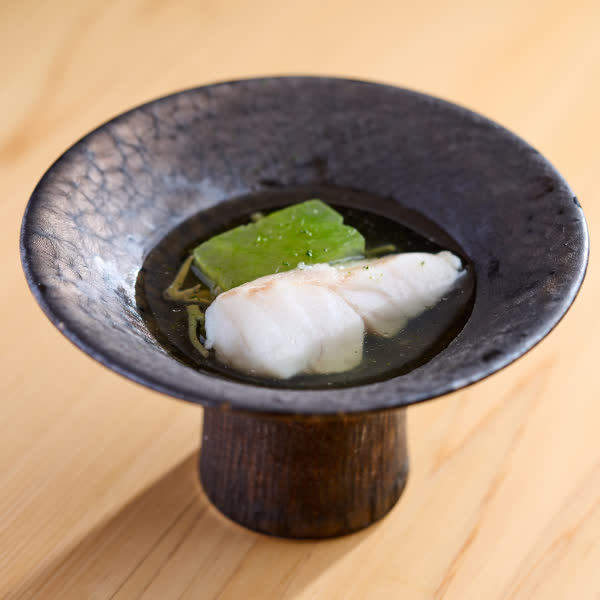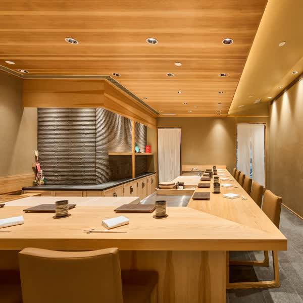 At Sushi Wadatsumi, we embrace natural architectural materials, primarily wood and stone, to create a dining space that exudes comfort and tranquility. The height of our tables and chairs is meticulously designed to ensure maximum comfort for our guests. We use standard-height dining chairs paired with elevated platforms, allowing guests to communicate effortlessly with the chef without having to lift their heads.